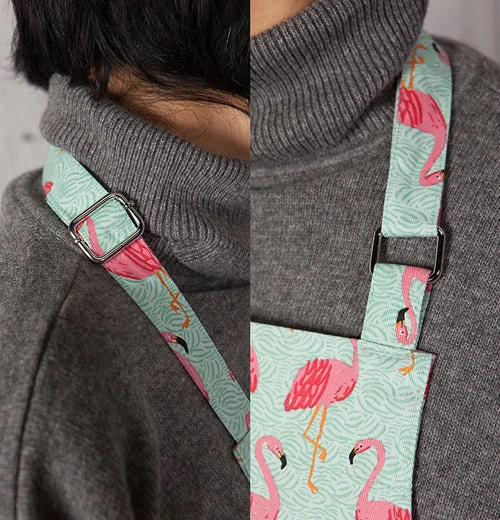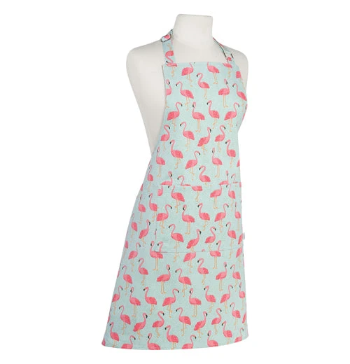 You’ll feel like cooking a tropical meal when you wear the “Flamingos” apron. This chef apron features pink flamingos over a turquoise background. This apron has an adjustable neck strap and sturdy belt ties for an excellent fit.Â