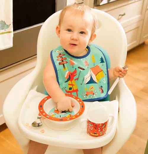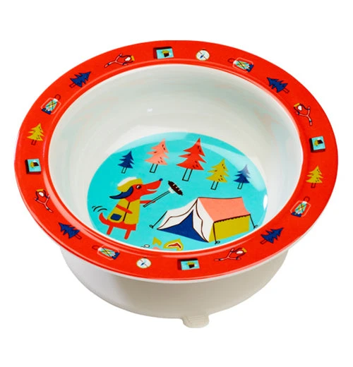 Your little one will have a dog gone good time eating out of the “Happy Camper” suction bowl. This cute kids bowl features a dog camping in the woods holding a hot dog on a grilling skewer. The removable suction base is designed to keep the bowl in place on most smooth surfaces.