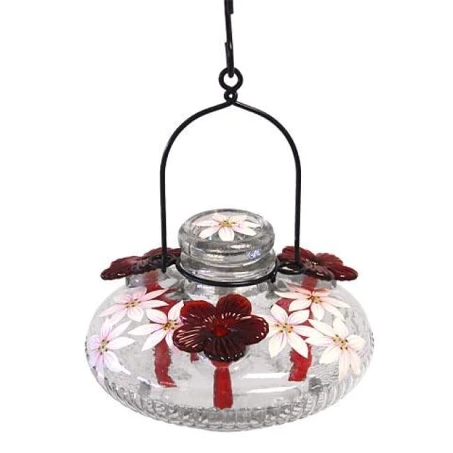 Bring some floral style to your garden or yard with the “Bloom Botanica” clear hummingbird feeder. The clear-blown glass reservoir features white flowers with red flower-shaped feeder holes. The decanter style top removes easily for filling.