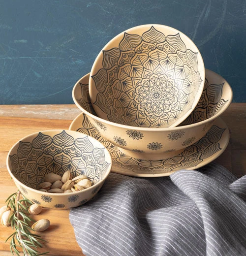 Serve up whatever you like in this wonderfully designed stamped Mandala bowl. Made from porcelain, this bowl showcases considerable durability withstanding long-term use and being very easy to clean after every meal.