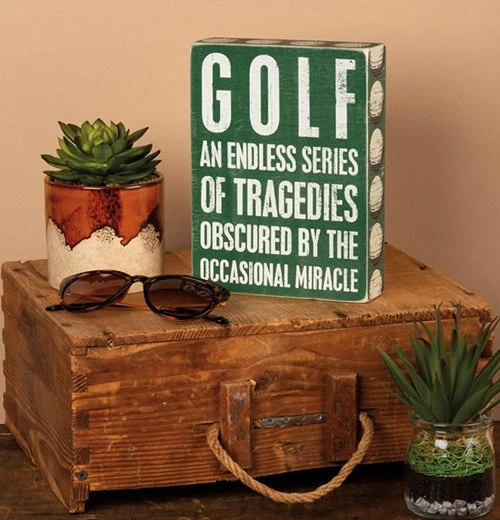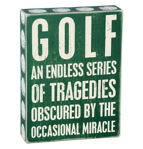 Golfers will love to place this classic box sign on their shelf, table, or wall. It says, “Golf An Endless Series Of Tragedies Obscured By The Occasional Miracle” in white letters over a green background. It features white golf balls on the edges.