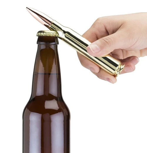 Open up your bottles as quick as a bullet with the bullet-shaped bottle opener. This gold colored bottle opener is shaped like a 50 caliber bullet with a copper-colored tip. Give this bullet-shaped bottle opener to the hunter or gun collector in your life.