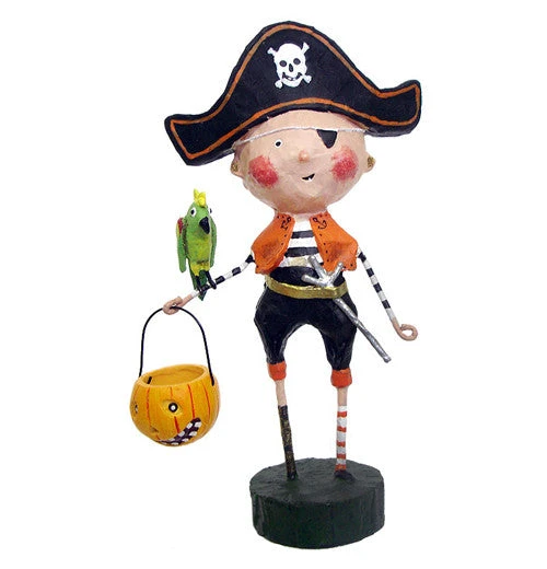 Ahoy, mateys. “Captain Kidd” is ready for a fun night of trick-or-treating on Halloween night. This cute boy figurine wears a pirate costume complete with an eye patch, parrot, and hat.