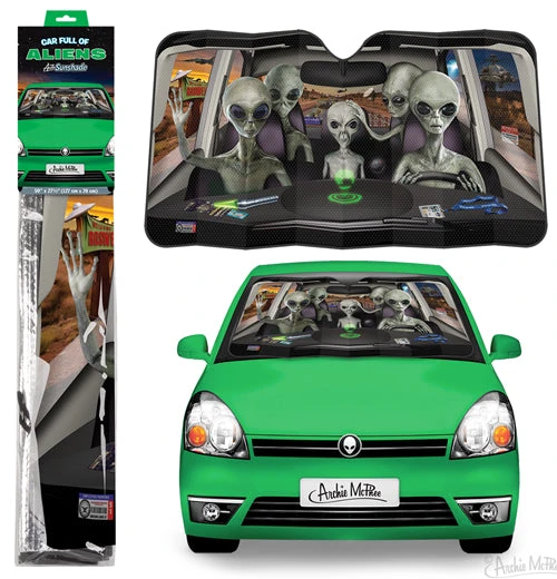 This Car Full of Aliens Auto Sunshade makes it look like you’re escaping from Area 51! Through the advanced, futuristic power of shade, this sunshade will allow you to park in the sun without your interior turning into a warp core meltdown. Features a group of gray aliens, not their mortal enemies — the lizard people, escaping from a secret government lab.