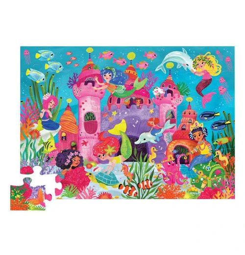 Help your little ones learn their fine motor skills and hand-eye coordination by putting together the Mermaid Palace puzzle. It has the design of mermaids swimming around an undersea castle with their underwater friends. This puzzle has 36 jumbo sized pieces, perfect for little hands to hold.