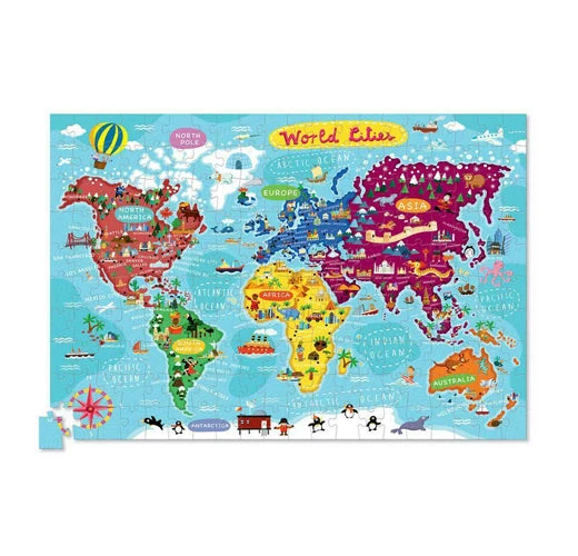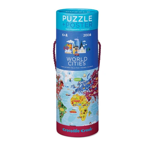 Crocodile Creek brings you a wonderfully colorful jigsaw puzzle/poster of the world and its cities. When pieced together, this 200-piece puzzle features a map of the world with world cities featured on each continent.