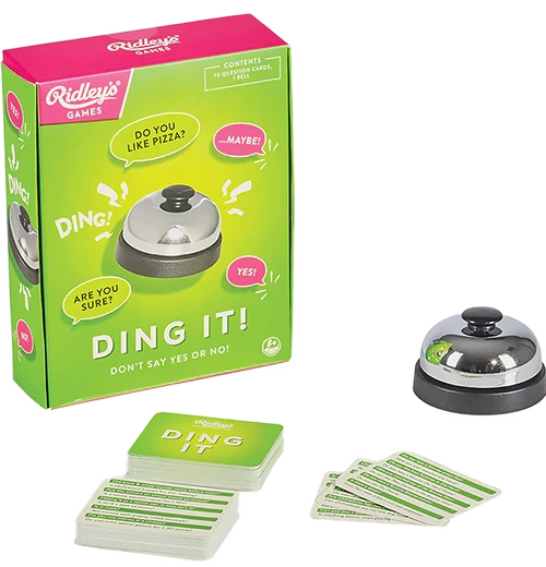 The quick-fire question game where your opponents can ding you out and steal the round if you hesitate, repeat a previous answer, or answer ‘yes’ or ‘no’. Ding It Game is a card game that will challenge your brain and knowledge