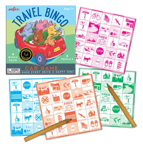 Beautifully illustrated by Saxton Freymann, “Travel” bingo is an easy-to-play game for the car. Features lovely renditions of things we all see while traveling the roads of America. Includes 4 pads of bingo sheets that you can write on and 4 pencils. Features an easy-to-store tray box that will fit easily into any glove compartment.