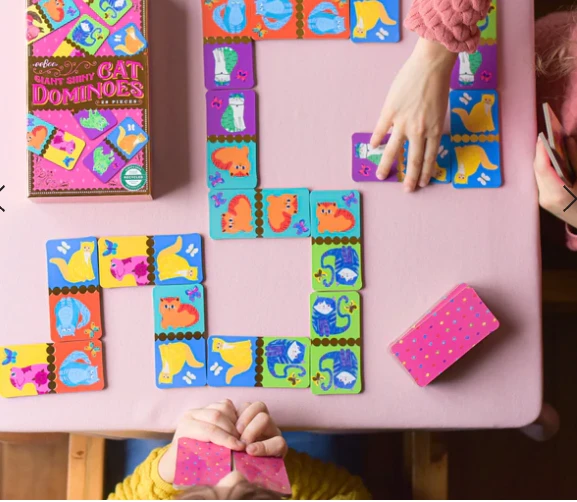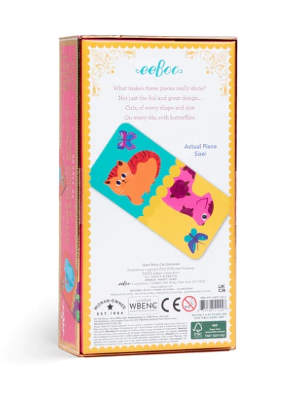 Giant Shiny Cat Dominoes will be sure to intrigue all feline lovers. Each die-cut domino piece features two fanciful cats with shiny gold foil highlights. The set includes twenty-eight dominoes that are 4.5 x 2.25 inches – a perfect size for young players. The classic game of dominoes develops matching skills and is one the whole family can enjoy together.Â