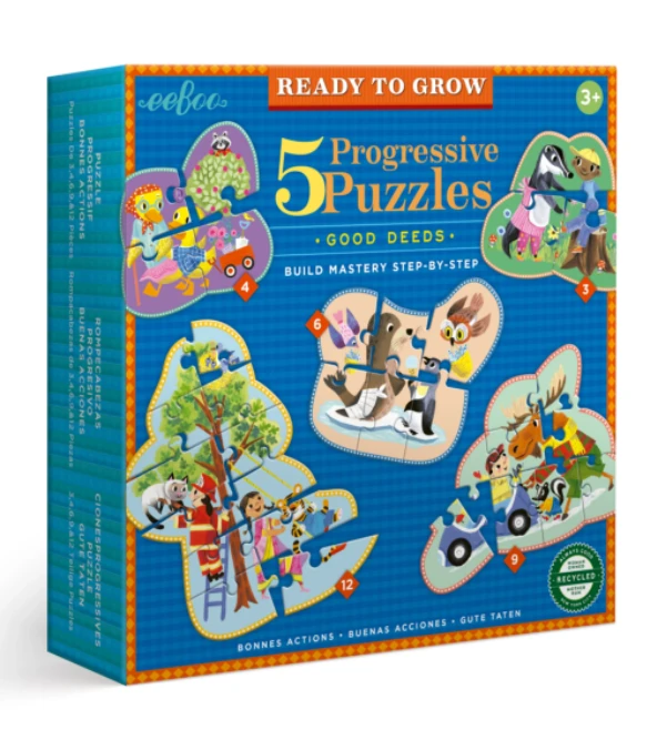 Good Deeds Ready to Grow Progressive Puzzle set includes 5 different puzzles of varying complexity. The colorful and humorous illustrations of people and animals doing nice, kind deeds for one another are featured on each puzzle. Each puzzle has a uniquely-colored background and border to aid in sorting the pieces, the first step in completion.