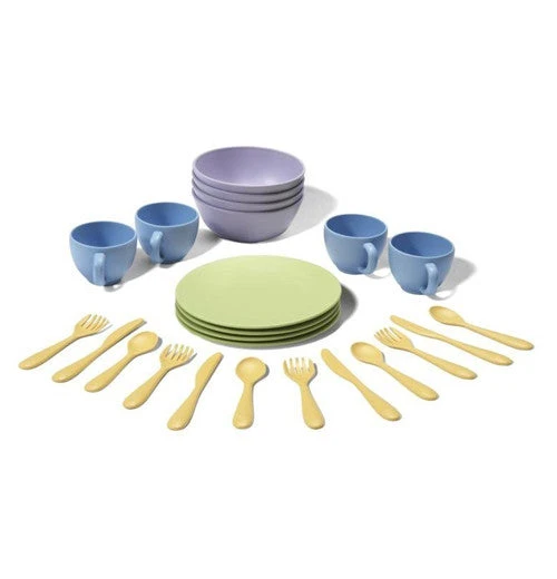 Go green at every meal with this dish set. These environmentally safe dishes will encourage fine motor skills while being safe for the planet. This dish set includes 4 purple bowls, 4 pastel green saucers, 4 blue cups, and 4 yellow knife, fork, and spoon sets.
