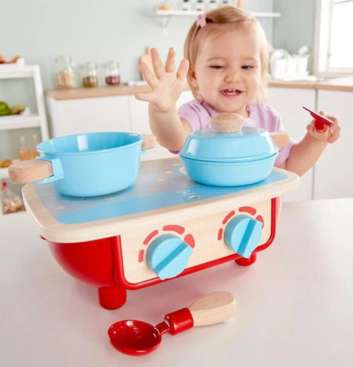 This cute toddler kitchen set will make a nice addition to any play area or nursery. This fun wooden stove comes with one pot with a lid, one frying pan, one spoon, and one spatula for you to cook with, all perfect for little hands. Features knobs that click cutely when turned. Store your pot and pan in the spaces behind the hob when you’re done.