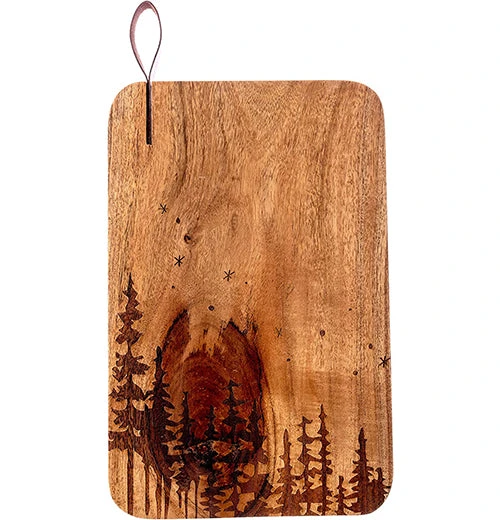 Have the “Trees” etched cutting board out for slicing cheese, meat, and bread for your guests. The design on this cutting board features fir trees over a natural wood background. Give this cutting board as a gift or keep it for yourself.