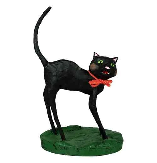 It will be GOOD luck when this black cat crosses your path. This black cat figurine arches its back as if you accidentally startled the poor kitty when you happened upon it. However, a red ribbon around the neck tells us it is at least well-loved by someone. Purr-fect to add to a Halloween or cat-related collection.