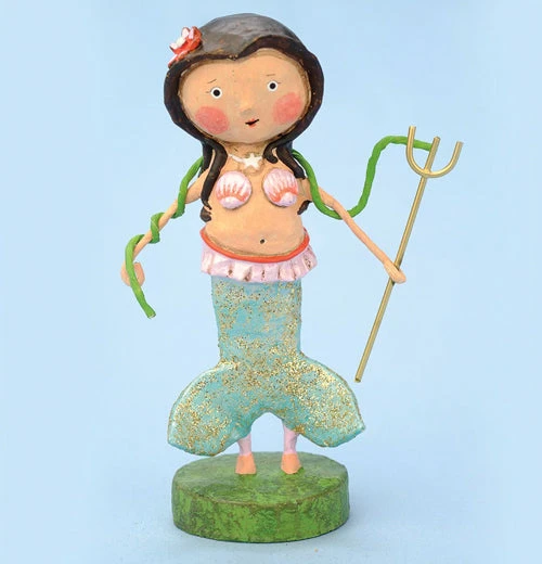 Marina Mermaid holds a gold trident. She has a piece of green seaweed wrapped around her shoulders, and has a starfish necklace and a seashell bikini top. The turquoise fish bottom skirt with gold glitter completes the look of the costume.