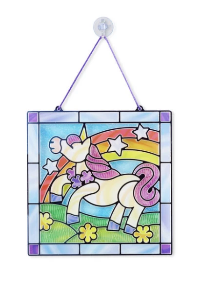 - Craft kit to create a luminous picture of a unicorn and rainbow that looks just like stained glass
