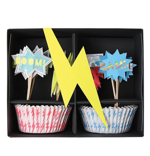 Throw your kids a super party with the Super Hero cupcake kit. This kit features two sets of cases: one set with red lightening bolts and the other set with blue lightening bolts. Kit also includes 24 cupcake toppers in 4 styles. Get your little super heroes excited about their birthday party.
