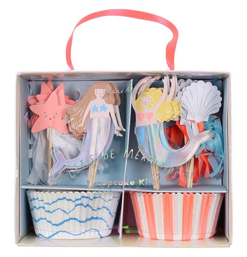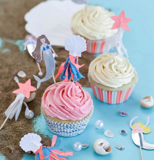 Throw an ocean themed party with the Let’s Be Mermaids cupcake kit. This cupcake kit features 24 cases in 2 styles; one set is white with blue waves, and the other features pink and white vertical stripes. This kit comes with 4 styles of toppers: a brunette-haired mermaid, a blond-haired mermaid, a starfish, and a scallop shell.