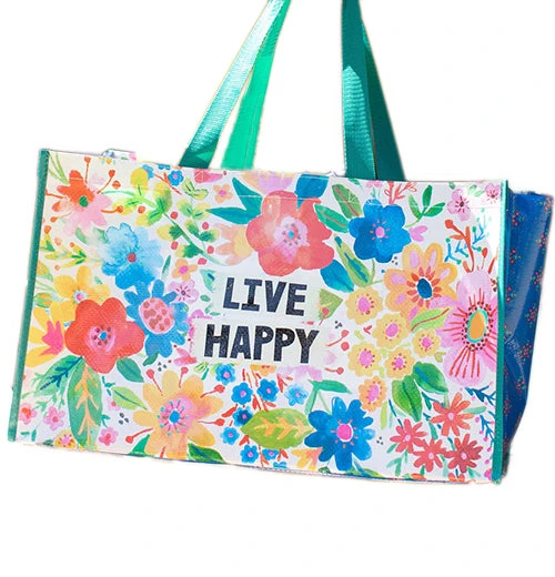 This tote is a wonderful reminder to “Live Happy!” Its bright and colorful print will look cheerful as you carry your groceries through the stories. You can even use the bag as a gift sack for larger gifts.