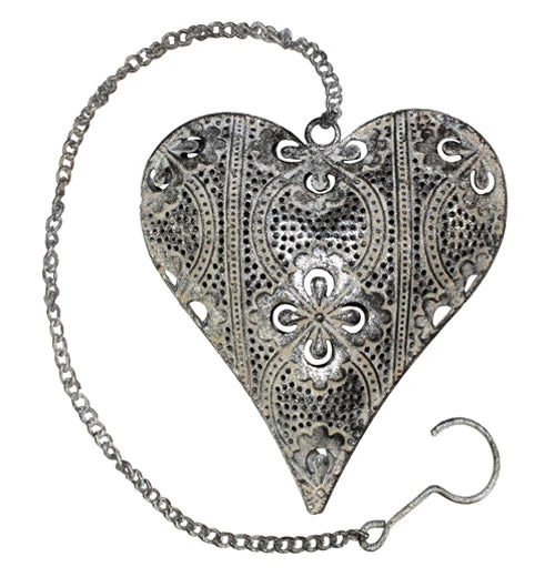 This “Nika” metal hanging heart is made of antique silver. This heart can be hung in any room to add an antique look to the home. Makes a great gift.Â
