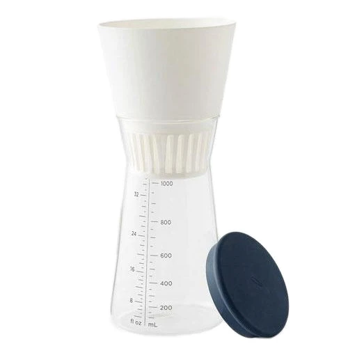 - Comes with reusable mesh filter, silicone spill-proof lid for storage, and recipes
