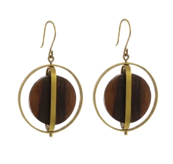This set of wooden and brass earrings will go well with any attire. The earrings feature Flat discs of Javanese Teak that give dimension and movement when floated in brass cages. The earrings are made of teak wood and brass and measure 1.25″x2.25″.
