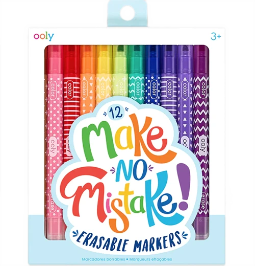 Just flip the Make No Mistake Erasable Marker over and erase it if you go outside the lines. Create unique designs by using the eraser end to add detail or texture to your coloring. The chiseled tips allow for either broad or narrow strokes.  With twelve colors included, it’s all the variety you need. It’s coloring fun for anyone!