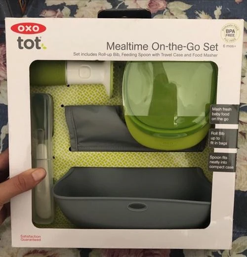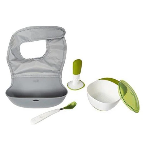 - Set includes: Food Masher, Roll-Up Bib, Feeding Spoon with Travel Case