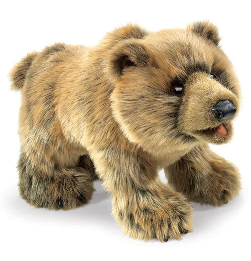 Sniffing around for a snack, this puppet is also hungry for love! Decked out in thick, soft, gold-tipped plush, with soft claws and a movable mouth for chewing or chitchat, this bear will soon be your huggable friend.