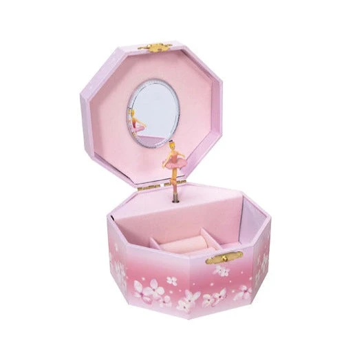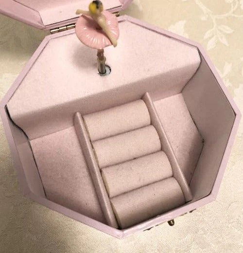 The Ballerina Jewelry Box is the perfect place to keep your most valuable treasures! This musical jewelry box will make you twirl with delight! Featuring a pink hexagon-shaped box and a twirling ballerina in a pink tutu, playing “Swan Lake” when opened.