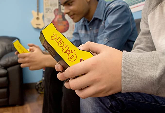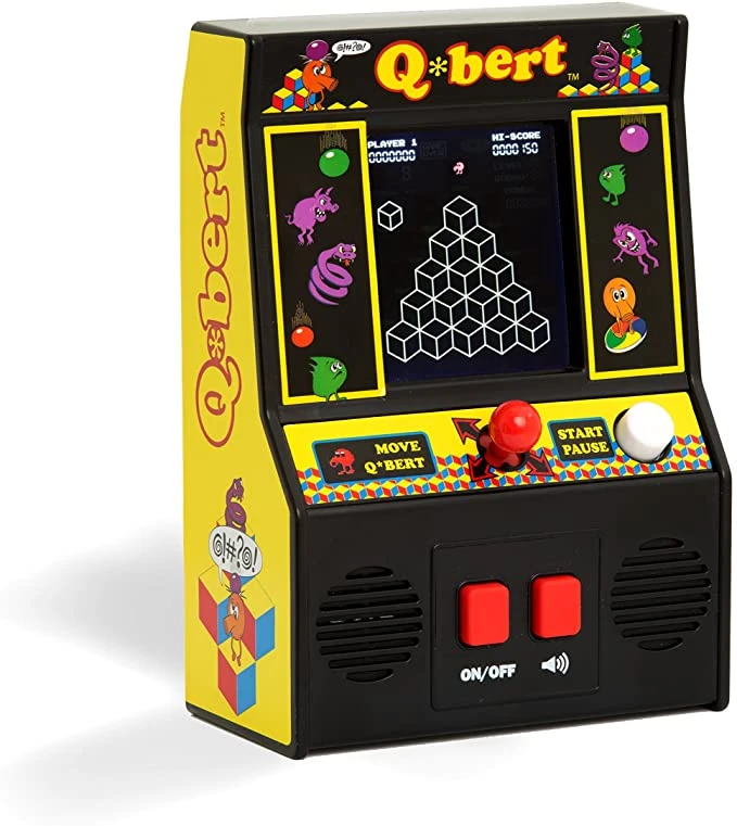 With this “Q-Bert” mini arcade game, you get to move Q-Bert to each cube in the pyramid before the bad guys squash him. It looks and plays like the original with an arcade style joystick and music too! No coins required just click the start button and start jumping around the 3D isometric cubes avoiding Slick and Coily. Multiple challenge levels of play included in this color LCD game.