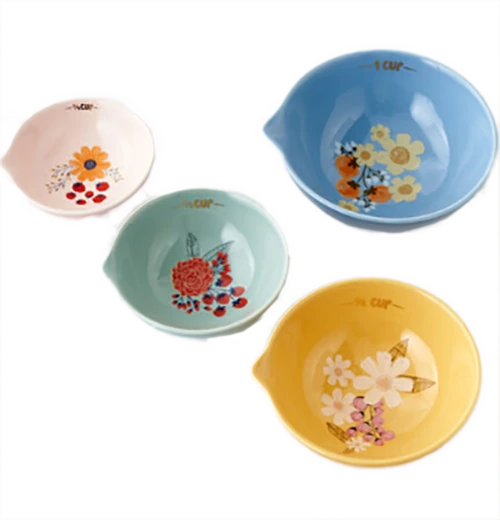 This set of 4 berry and floral-themed porcelain measuring cups will make a great addition to your kitchen. They are all different colors with different size capacities, the largest one being one cup.
