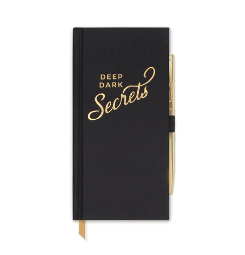Keep your “Deep Dark Secrets” in this slim black cloth-bound journal features 160 lined pages of acid-free deluxe paper. A beautiful gold foil stamped cloth-bound cover is great for keeping your deep dark secrets. The journal also features an expandable pocket, informational pages, ribbon marker, and a gold pen in an elastic holder.