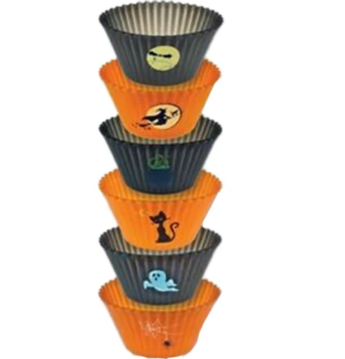 Bring a spooky touch to your kitchen with this set of Spatulart Halloween cupcake molds. This set of 12 sturdy cupcake molds features 6 designs black cat, cauldron, witch, spider, ghost, and bat. These are reusable and can stand alone on a baking sheet!