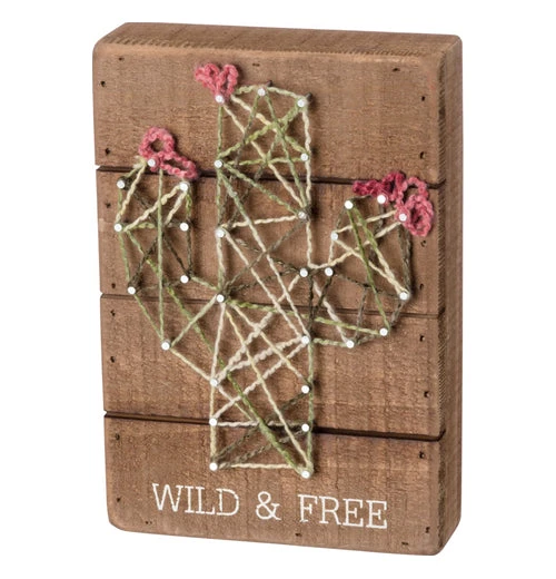 Hang this beautiful string art on your wall for a western motif. The slatted wooden box sign features a string art cactus design with chunky primitive yarn and the words “Wild & Free” in white.