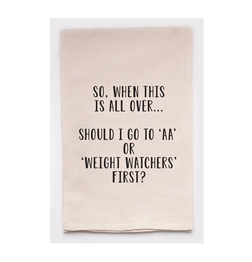Keep your kitchen spotless with the “AA Or Weight Watchers” tea towel. This wonderful towel reads “So, when this is all over… Should I go to ‘AA’ or ‘Weight Watchers’ first?” in black words over an off-white background. This hand-sewn towel will make a perfect housewarming gift.Â