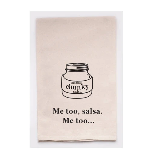 Keep your kitchen spotless with the “Me Too, Salsa” tea towel. This wonderful towel reads “Me too, salsa. Me too…” in black words over an off-white background. This hand-sewn towel will make a perfect housewarming gift.Â