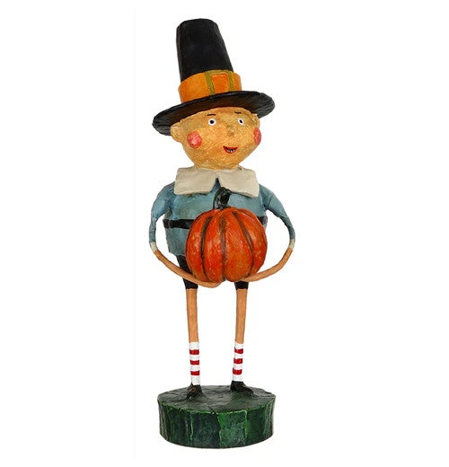 As we enter into the season of giving, show your Thanksgiving spirit with “Tom.” This adorable pilgrim figurine would be the perfect centerpiece for your family meal this holiday. Tom is wearing a traditional pilgrim outfit, complete with pilgrim hat with buckle on it, and is holding a pumpkin.