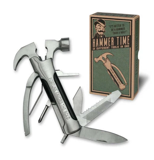The “Hammer Time” Multi-Tool combines 12 functions in 1 tool. Perfect for small home projects and easy to keep handy in your dashboard, kitchen, or desk drawer. The handle is engraved with the phrase: “Fortune Favors The Bold”.