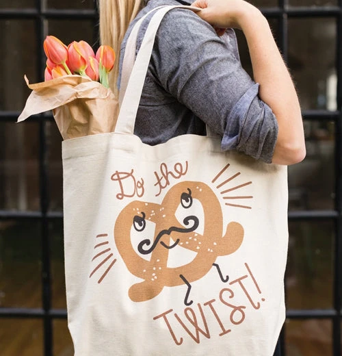 This generously sized cotton tote bag packs a lot of personality and more produce from the farmers market, books from the library, or treasures from the store. This bag features a pretzel saying “Do the Twist!,” referencing the song by Chubby Checker.