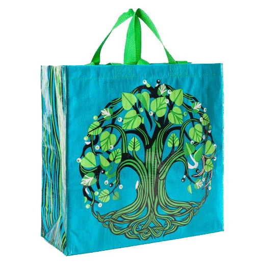 The Tree of Life shopper bag will allow you to show off your deep roots to your local businesses. It has the design of a green and black tree with white flowers sprouting from it over a blue background.