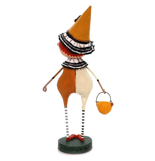 “Trick-or-Treat Clown” is not fooling around about Halloween. He has a painted face with one eye painted with a star over it and red rosy cheeks. The clown costume is orange and white with black accents. Place this figurine on your shelf or mantle for your Halloween decor.