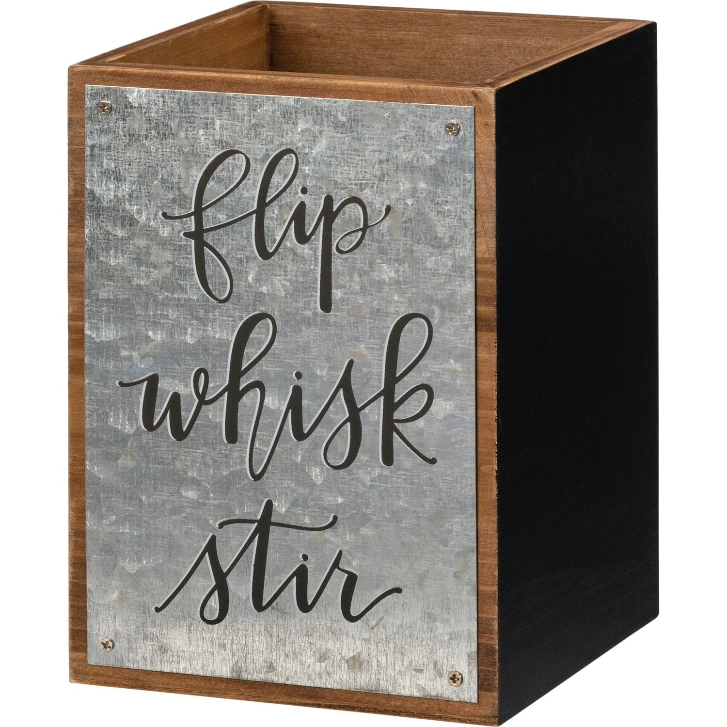 A wooden utensil holder featuring a galvanized metal panel with hand-lettered “Flip Whisk Stir” sentiment. Keep your kitchen counter clutter-free with this stylish utensil holder.Â